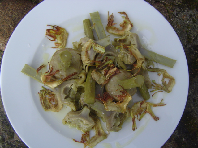 En el plato se mezclan las alcachofas crudas y las cocidas y se riega con un buen aceite de oliva virgen se añaden unas escamas de flor de sal y listo.