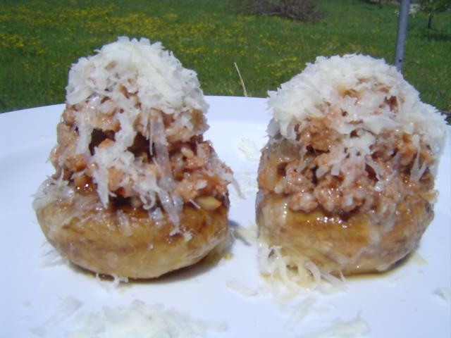 Champiñones rellenos de carne picada con idiazábal de Gordoan. /Canelón de patata relleno de sobras de carrilleras guisadas.