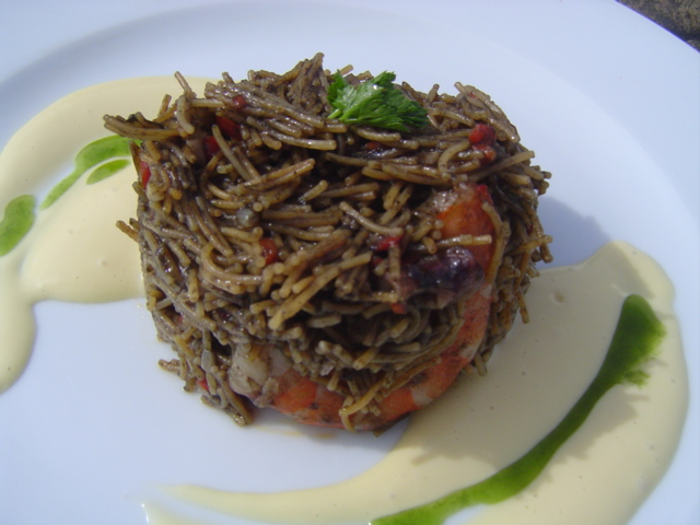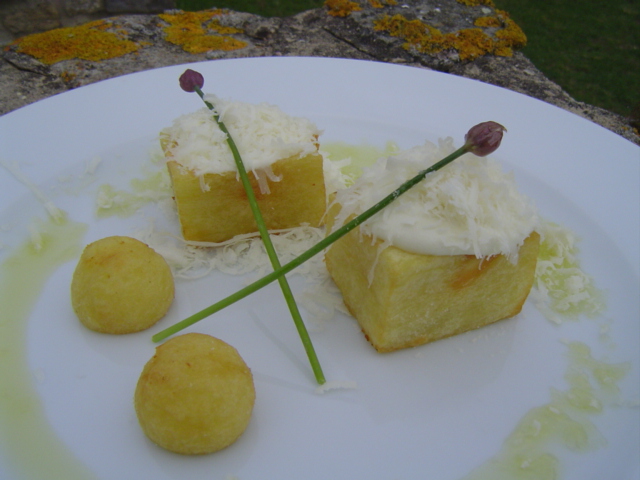 Patatas confitadas rellenas de brandada de bacalao con txapela de idiazábal de La Leze. / Fideua negro con salsa ali oli.