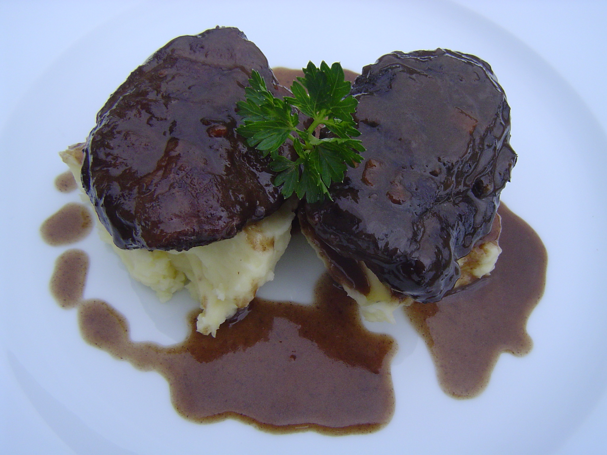 Revuelto de morcilla de arroz en pan de pita. / Carrilleras de cerdo ibérico al vino tinto con puré de patata.
