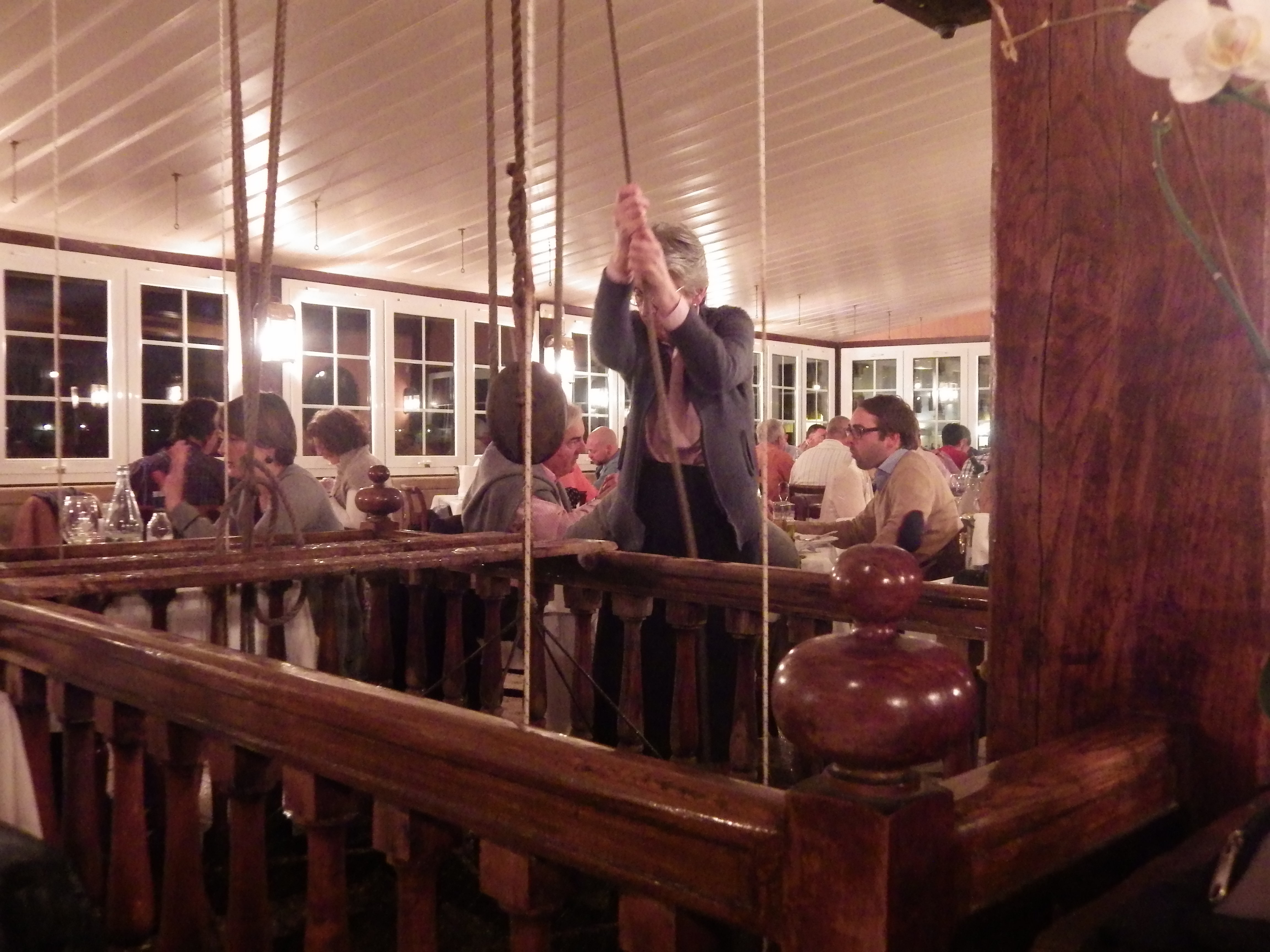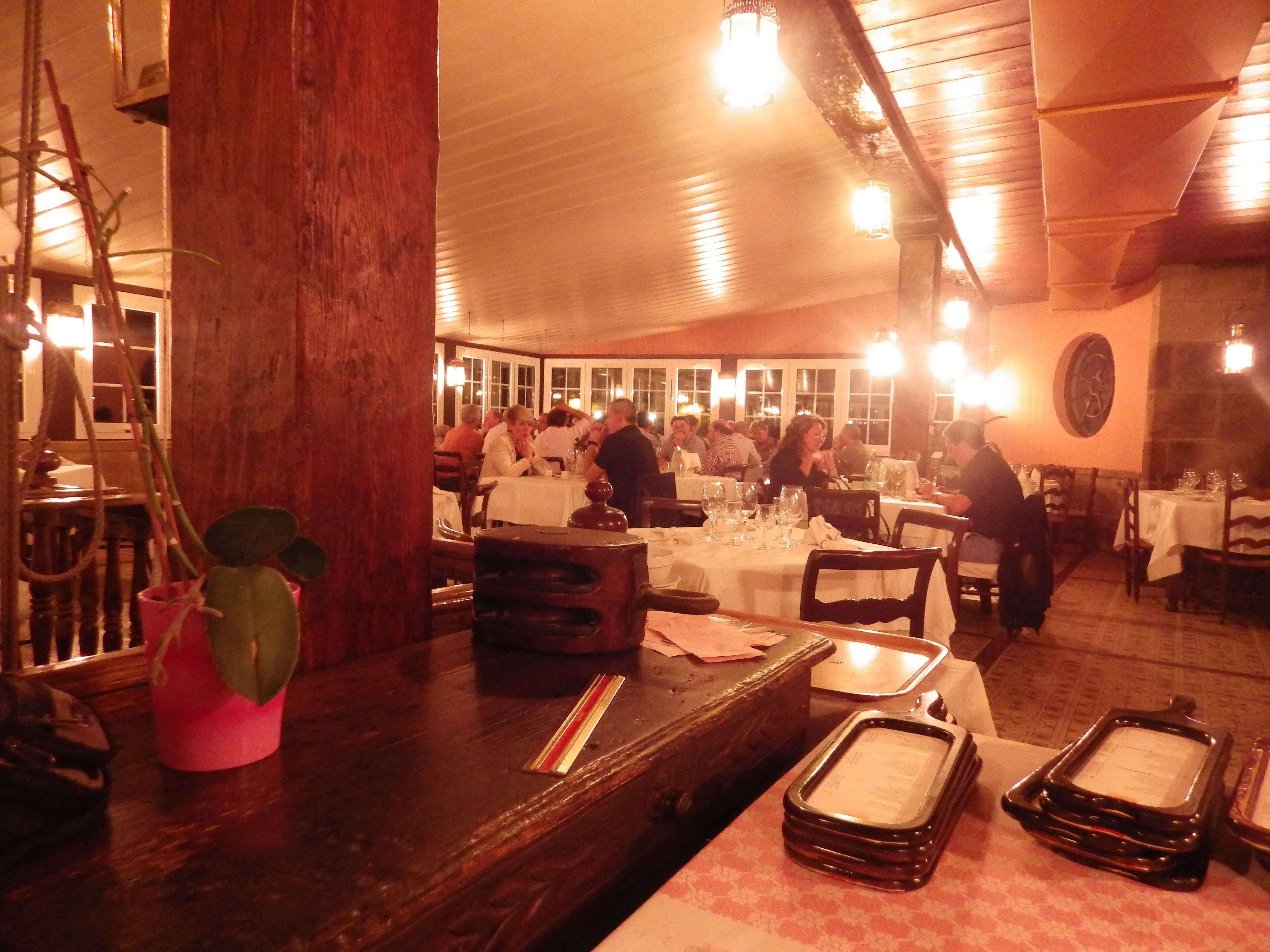 Tiene un comedor amplio con unas cristaleras que dan a la bahía de Pasaia, lugar que me fascina por su belleza decadente; grandes grúas portuarias, montones de chatarra, algún barco oxidado amarrado en Trintxerpe, la contaminante central térmica de Iberdrola que por fin se cerró en 2012, viejas naves abandonadas con historia… un lugar que ha conocido mejores tiempos pasados. Es de noche y se ven multitud de lucecitas del puerto brillando enfrente del comedor. La comandera es una delgada señora de cierta edad, que se mueve inquieta por todo el comedor, la espalda un poco encorvada, concentrada en lo que hace, toma nota de lo que queremos: almejas a la marinera, gambas plancha y de segundos bogavante y rodaballo. Me dice que se ha quedado sin rodaballo pero que el mero está muy bueno; acepto su propuesta. Me da la impresión de que a la señora no le gusta mucho dar palique, habla lo justo y siempre de forma educada. Se dirige al pozo que tienen en un extremo del comedor de donde con un sistema de cuerdas y poleas sube un cesto pletórico de bogavantes vivos, abre una portezuela, elige con esmero la pieza que le hemos demandado y marcha rápidamente a la cocina con la misera en la mano. En el fondo de ese goloso pozo, en otra cesta esperan su turno unas pacientes langostas.