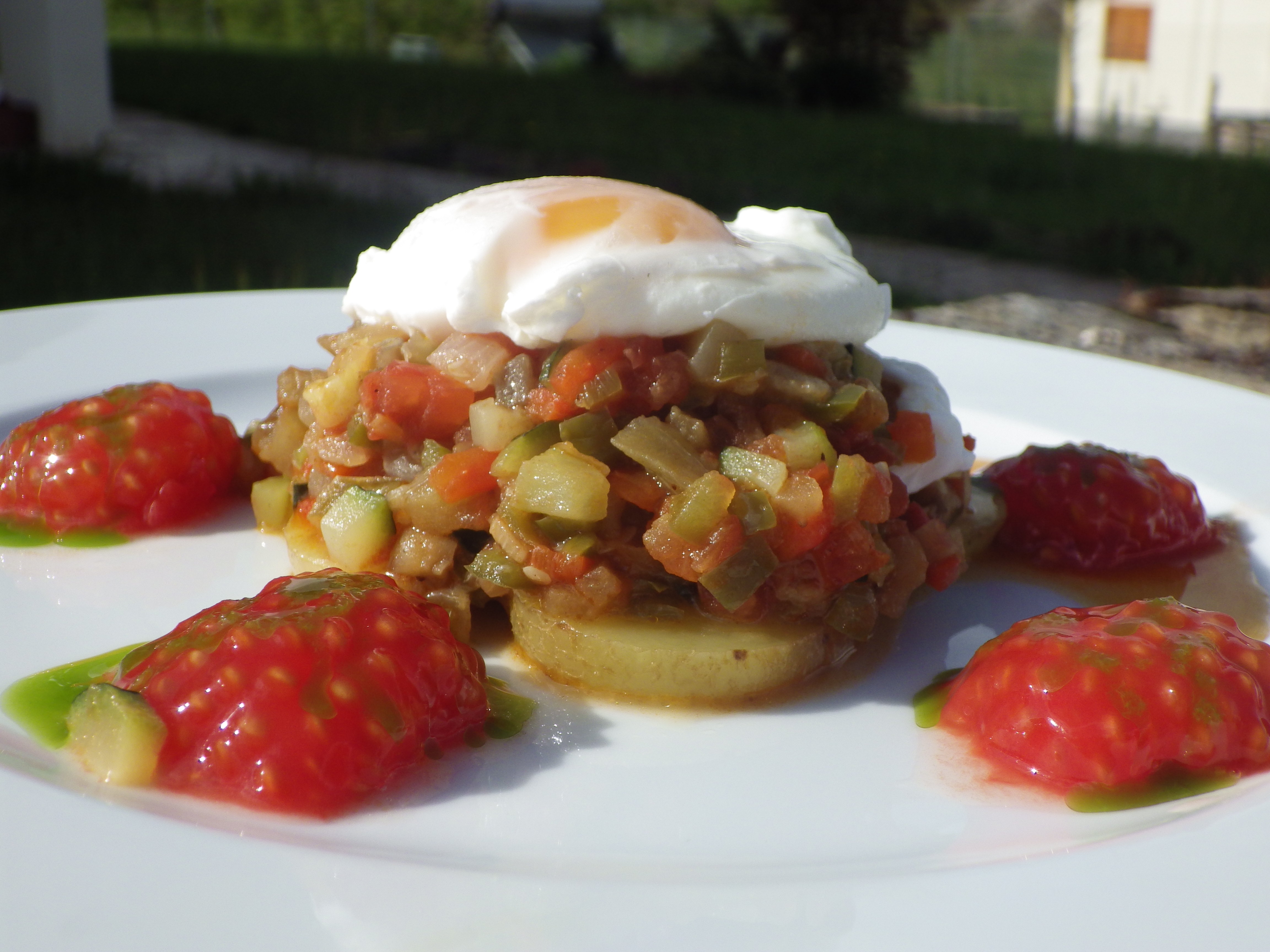Primero tengo que decir que pongo el pisto sobre unas patatas nuevas confitadas en aceite de oliva con un par de dientes de ajo y unas ramitas de tomillo limonero. Para confitar las patatas nuevas, se lavan bien y sin pelar se cortan en rodajas más o menos gordas, se cubren de aceite de oliva añadiendo el ajo y el tomillo. Yo las confito en el horno a unos 100 grados durante 30 minutos. Mientras se van confitando las patatas se limpian todas las verduras y se pican finitas. Primero se añade la cebolla y el ajo y se cocina un poco, después se añaden los pimientos verdes y rojos para que se vayan estofando. Al rato se añade la berenjena y el calabacín y se mezclan bien con el resto de los ingredientes estofándolas un poquito. Por último se añade el tomate al que con cuidado se le quitan las semillas que utilizaremos para decorar el plato. Se mantienen las verduras unos minutos al fuego, dependiendo del gusto de cada cual, más al dente o más pasadas. En un cazo con agua, sal y un chorrito de vinagre se escalfa el huevo unos tres minutos o hasta que la clara haya cuajado y la yema esté líquida. Se colocan en el fondo del plato las patatas confitadas bien escurridas de aceite, encima el pisto de verduras y por último el huevo escalfado. Se decora con las semillas de tomate y ya está.