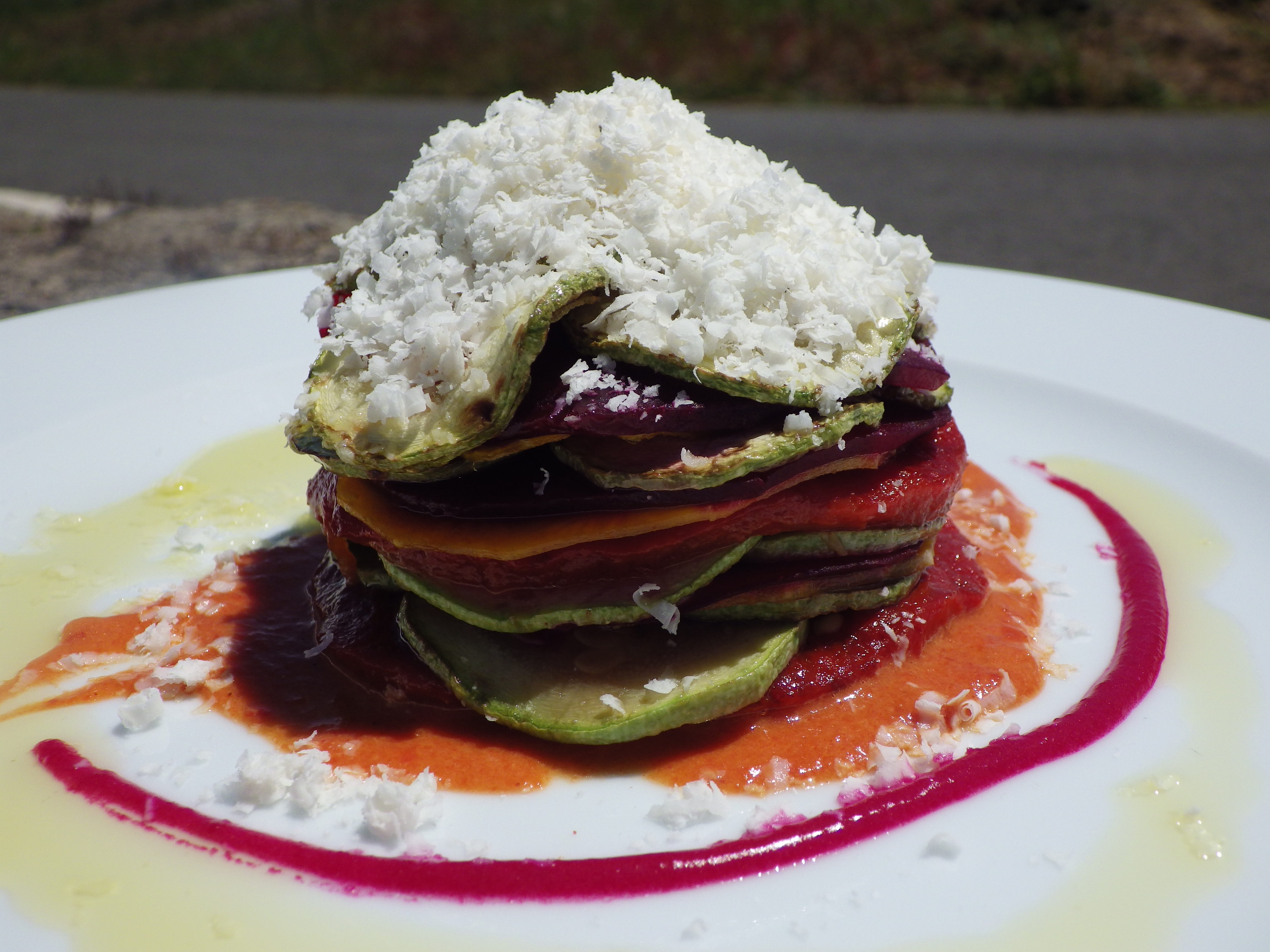 Para el montaje del plato primero se coloca una rodaja de calabaza asada, encima un aro de pimiento asado, encima unas rodajas de calabacín, encima del calabacín una rodaja de remolacha, y se repite este proceso hasta completar el milhojas. Se ralla un poco de queso del que se tenga a mano y se espolvorea por encima. Se mete al horno a gratinar y se sirve poniendo un poco de salsa de pimientos en el fondo del plato. También se puede calentar el milhojas en el horno unos minutos y añadir el queso rallado en crudo una vez que el milhojas está caliente. Se pone un poco de aceite de remolacha y ya está. A disfrutar!