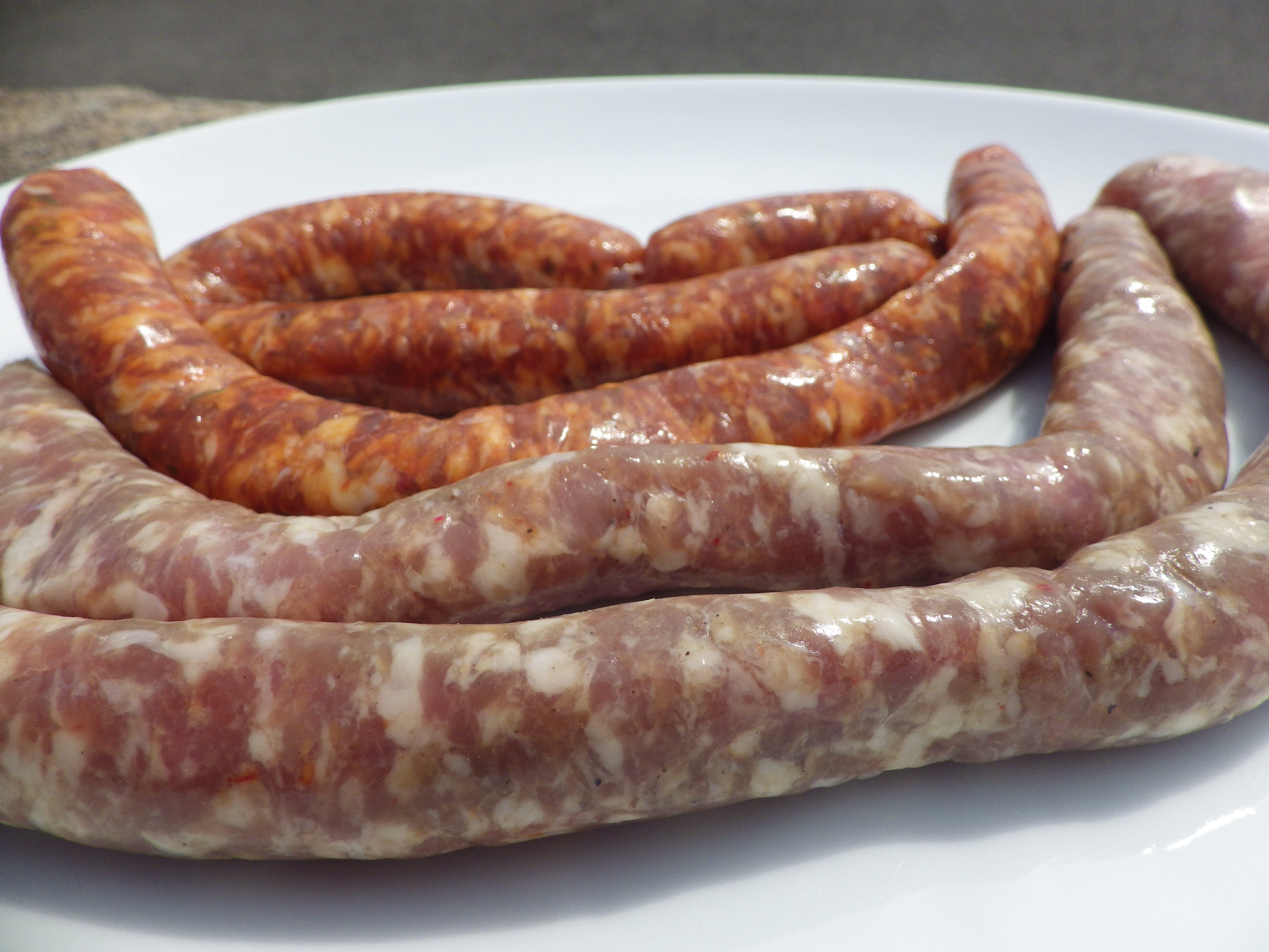 Este último fin de semana la descubrí en una carnicería de Senpere (Saint-Pée-sur-Nivelle). Tenían dos tipos, la lukainka tradicional de carnes magras de cerdo con tocino sal y ajo y la lukainka berri, a la que además de los ingredientes clásicos añadían tomate y pimiento de Ezpeleta (Espelette).