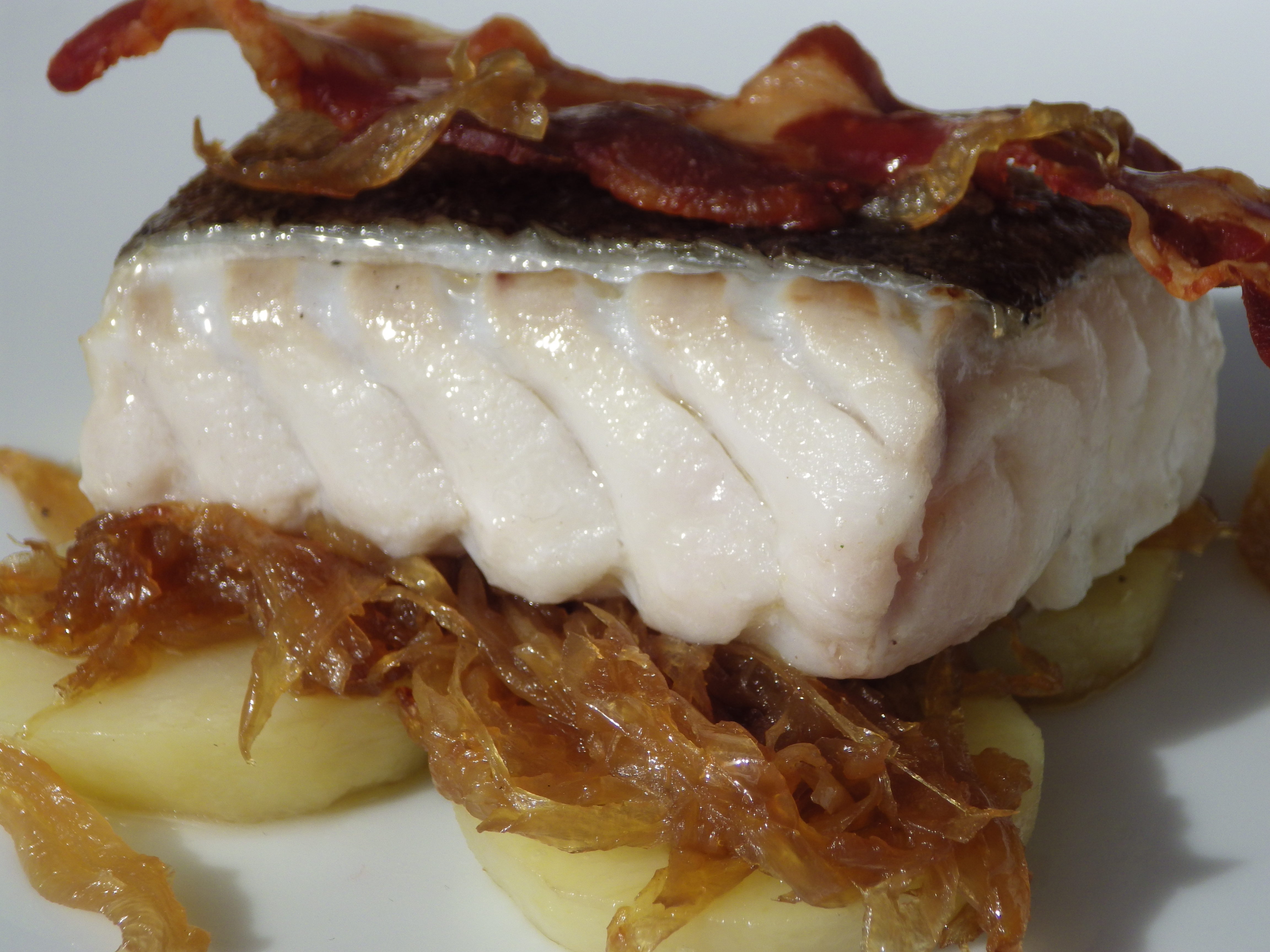 Skrei con cebolla pochada, patatas confitadas y panceta.