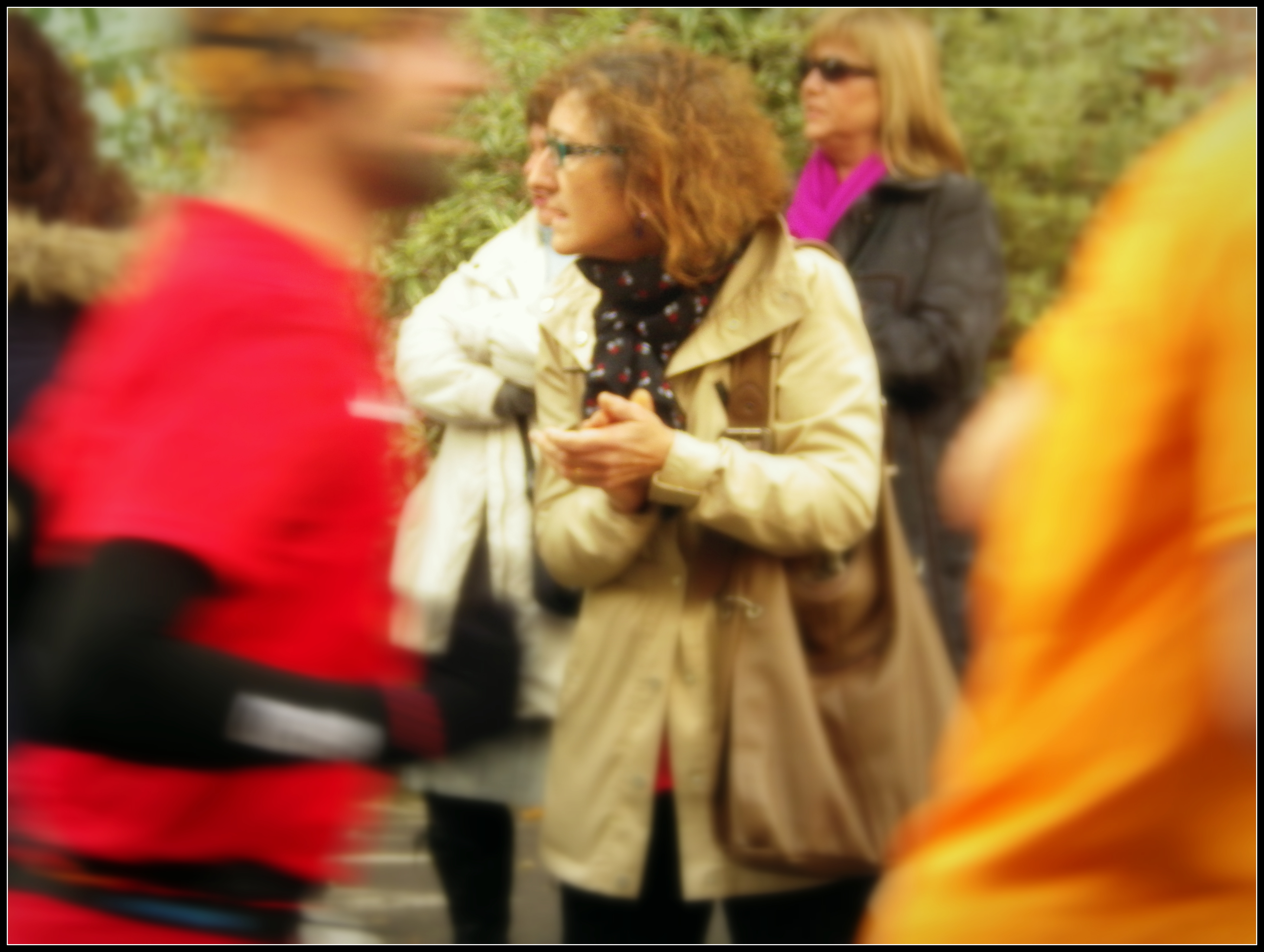 Gente muy mayor, otros empujando carritos de niños, caras de sufrimiento, olor a sudor, maillots chillones, corredores con minúsculas cámaras, algunos disfrazados, muchas senyeras y gente normal y corriente con ganas de disfrutar, siguen pasando ante gente entregada. Pasa Unai, pasa Lupo, pasan otros muchos que veo y no conozco y otros que no veo y conozco… Se puede disfrutar y se disfruta también desde las aceras.