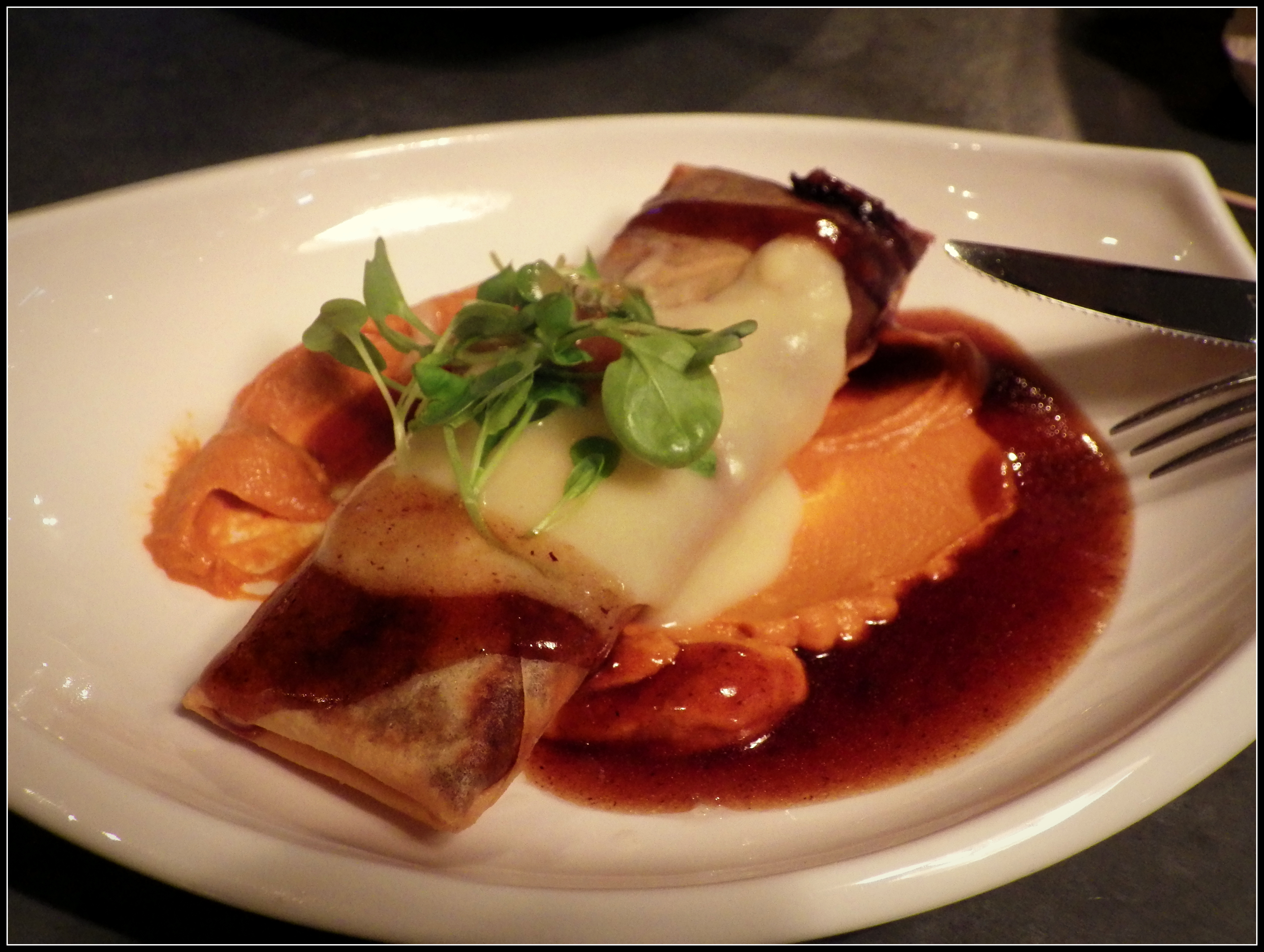 Es mediodía y toca aperitivo. Volvemos al local de la noche anterior, esta vez hay menos personal y nos sentamos en una de las mesas altas. Me fijo con detalle en el lugar: una cocina vista y bien iluminada donde trajinan varias personas, lámparas de estilo industrial, pizarras en euskera y castellano con la oferta de pintxos, otra con los vinos, varias mesas con sillas de estilos diferentes, un pequeño comedor en un espacio cerrado con puerta. Un lugar que me resulta acogedor. Esta vez pedimos varios pintxos: ravioli crujiente de morcilla y manzana, muy rico; seguimos con unas patatas asadas con mojo verde, unas pequeñas rodajas de patata ratte, o eso es lo que a mí me parecen con su sabroso mojo encima, muy ricas. Nos animamos y pedimos unas tiras de calamar frito con alioli de aceituna negra, muy ricos y tiernos, con un ligerísimo rebozado; mi hija Uxue encantada con el alioli y con los labios bien negros. Sin poder parar pedimos uno de los pintxos que no estaba en las pizarras, sino en un cartel colgado debajo del botellero de la barra con fotografía incluida: “Nací en el Mediterráneo”, así habían titulado a una especie de lingote con una pinta muy sugerente. Pregunto a una de las camareras que es lo que lleva el pintxo y me explica que es una escalibada sobre una tosta de butifarra y gelatina de pimientos, meloso y muy sabroso. Repito gustoso Artuke de año. Encantados con los pintxos, con la profesionalidad de las camareras y con el lugar en general. En fin un lugar al que seguro que volveremos.